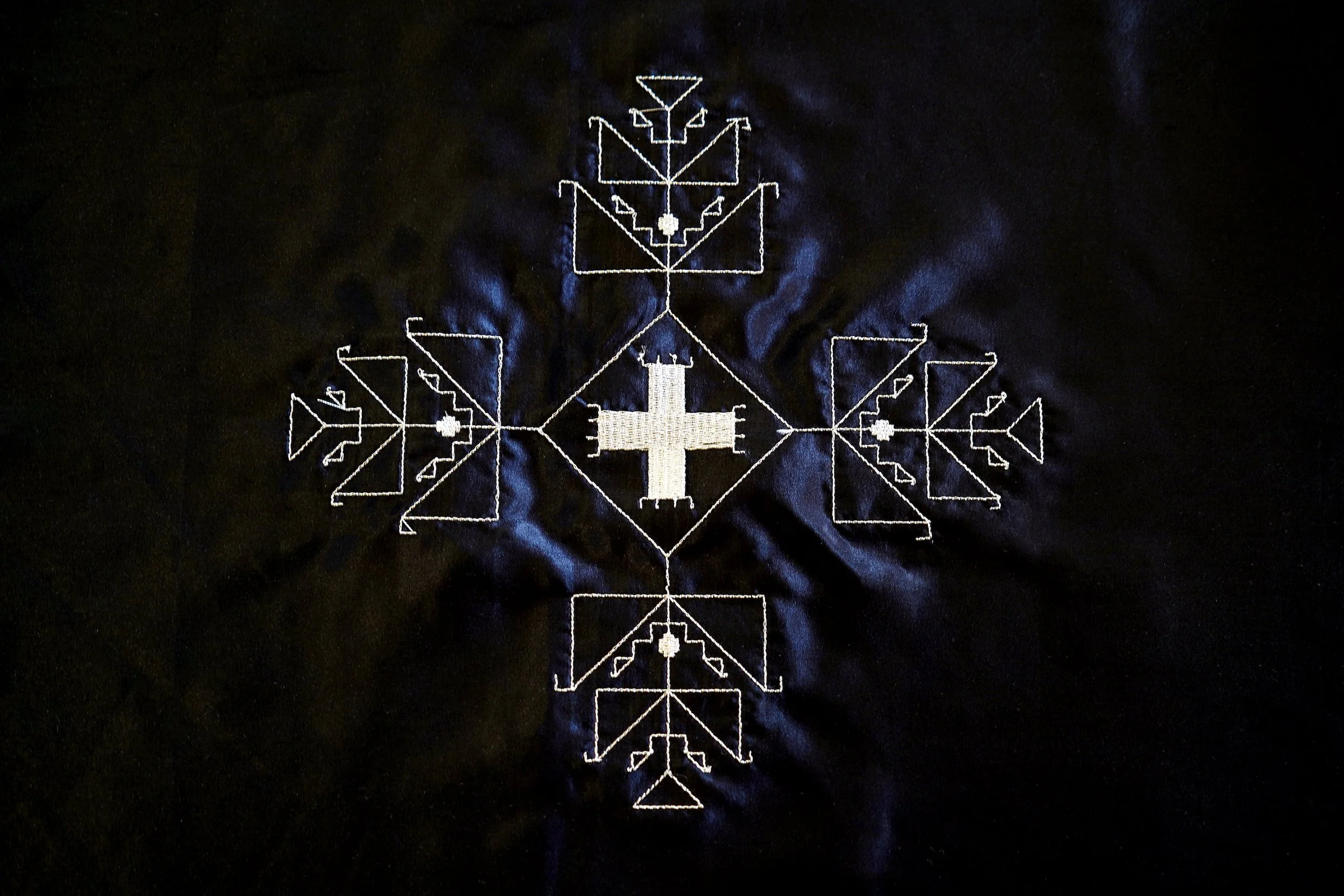 The installation brings together three interconnected works: the tactile embroidered score Wichahpih’a (a clear night with a star-filled sky) (2019), a new sculptural installation Stone Score (River of Light) (2025) comprising black deer hide, mirror, and river stones; and Her Dream Becomes a River (2025), a video work that translates the score into gesture, sound, and light through violin and percussion.